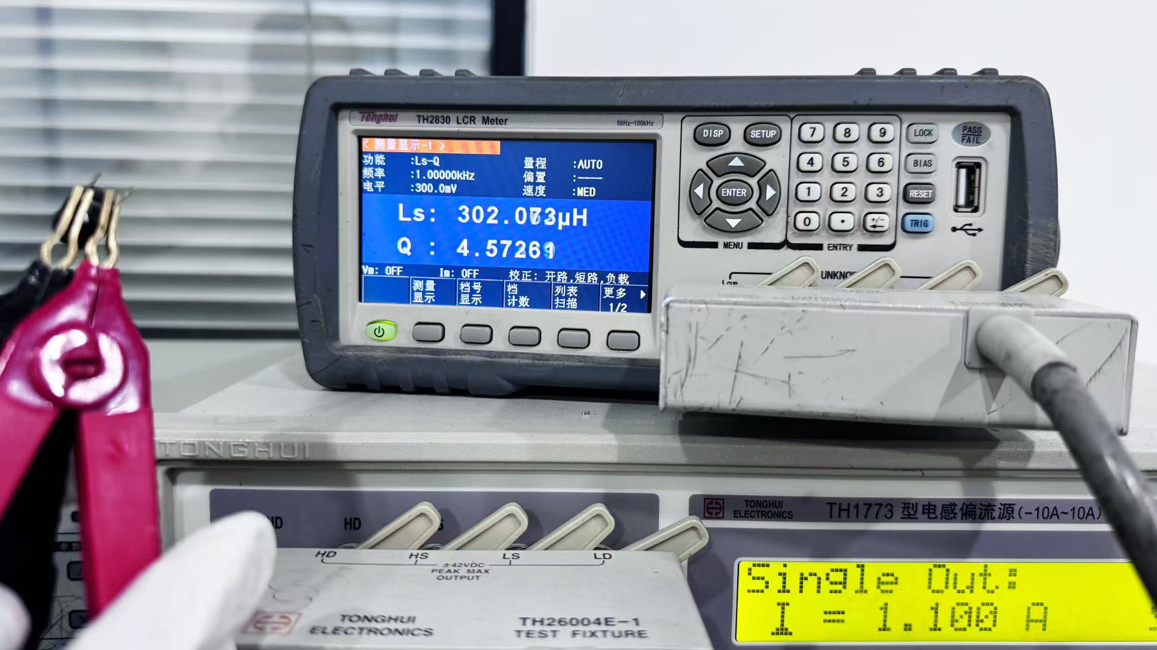 ? ? ? 這位老客戶最初選擇了谷景的工字電感0912、300uH ±10%、1K/0.3V的樣品,其規(guī)格為:阻值0.398-0.405Ω,感值300.6-306.7uH,1.1A變化11.5%,1A溫升32.2℃變化9.5%,長腳,0.65mm引腳,5mm腳距。在0.7A電流應(yīng)用中,這款電感完全滿足客戶的基本需求。